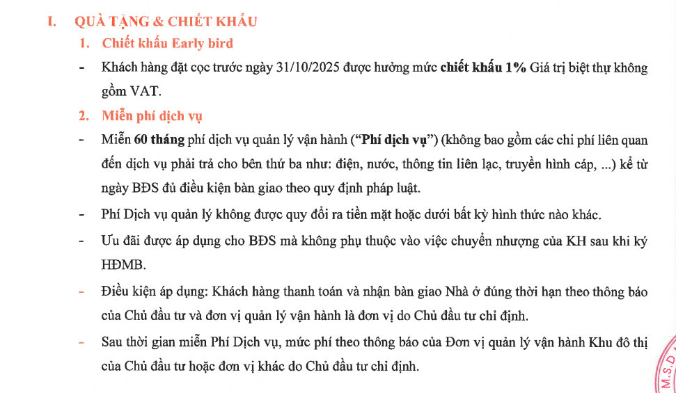 Khách hàng đặt cọc trước ngày 31/10/2025 sẽ nhận ngay chiết khấu 1% giá trị biệt thự (không bao gồm VAT). Đây là lợi thế giúp nhà đầu tư sớm đặt chỗ và đảm bảo suất căn đẹp trong quỹ hàng giới hạn của dự án.