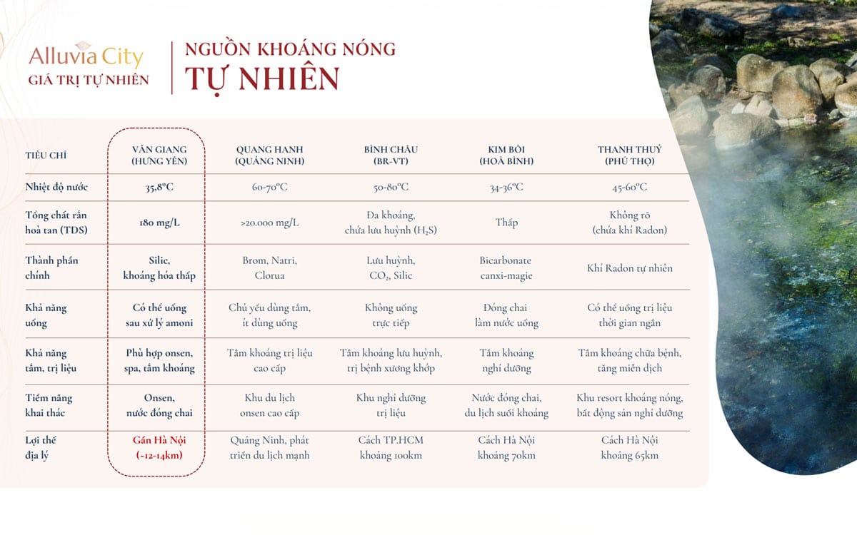 Đặc biệt, nhờ chứa hàm lượng Silic cao và thành phần khoáng nhẹ, suối khoáng tại Alluvia City rất thân thiện với làn da nhạy cảm. Đây là lợi thế nổi bật so với các nguồn khoáng có lưu huỳnh nặng hoặc chứa khí Radon như ở Quang Hanh hay Thanh Thủy.